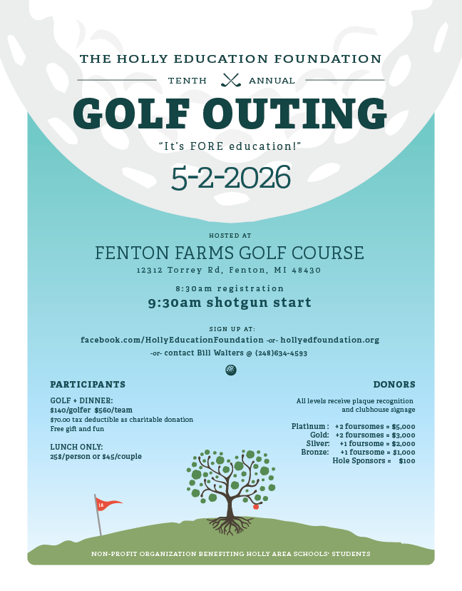 Our events are a great way for us to generate revenue and awareness for our cause. It's also a chance to meet great people and have a little fun. Sign up and join us in supporting the Holly Area Schools!